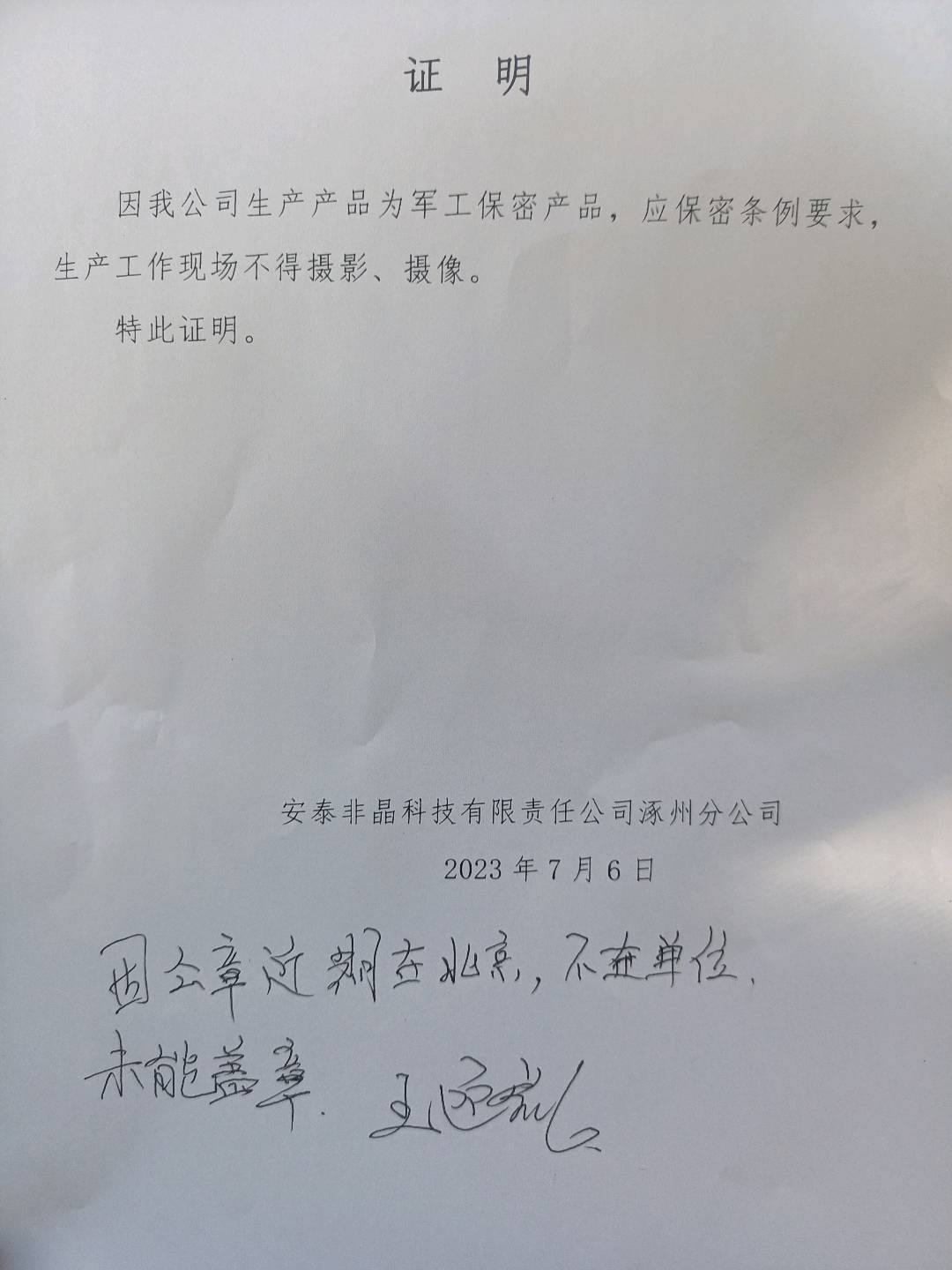 | 现场调查人员 | 王新树、毛国华 | 用人单位陪同人 | 王迎凯 | 时间 | 2023-07-07 |