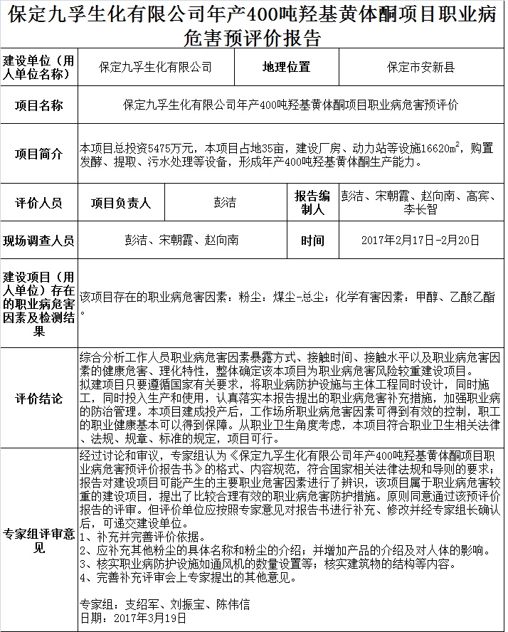 保定九孚生化有限公司年产400吨羟基黄体酮项目职业病危害预评价